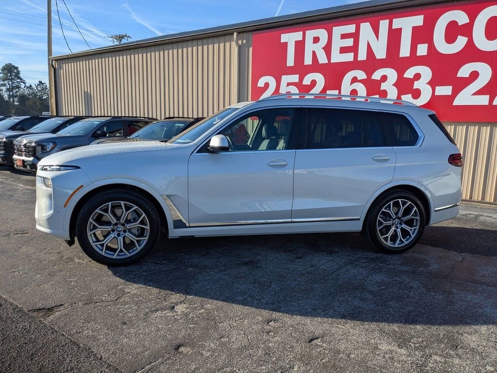 This X7 xDrive40i is nicely equipped with Connected Package Pro, X7 xDrive40i, 4D Sport Utility, 3.0L I6 DOHC 24V, 8-Speed Automatic Sport, AWD, White, Black w/Sensafin Upholstery, 10 Speakers, 3.64 Axle Ratio, 3rd row seats: split-bench, 4-Wheel Disc Brakes, ABS brakes, Adaptive suspension, Air Conditioning, Alloy wheels, AM/FM radio: SiriusXM with 360L, AM/FM Stereo, Apple CarPlay and Android Auto Compatibility, Apple CarPlay Compatibility, Auto High-beam Headlights, Auto tilt-away steering wheel, Auto-dimming door mirrors, Auto-dimming Rear-View mirror, Auto-leveling suspension, Automatic temperature control, BMW Assist ECall, BMW TeleServices, Brake assist, Bumpers: body-color, Compass, ConnectedDrive Services, Delay-off headlights, Driver door bin, Driver vanity mirror, Dual front impact airbags, Dual front side impact airbags, Electronic Stability Control, Emergency communication system: BMW Assist eCall, Exterior Parking Camera Rear, Four wheel independent suspension, Front anti-roll bar, Front Bucket Seats, Front Center Armrest, Front dual zone A/C, Front reading lights, Fully automatic headlights, Garage door transmitter, Genuine wood console insert, Genuine wood dashboard insert, Genuine wood door panel insert, Head restraints memory, Heads-Up Display, Heated door mirrors, Heated front seats, Heated Multi-Contour Seats, Heated steering wheel, Hi-Fi Sound System, Illuminated entry, Knee airbag, Leather steering wheel, Live Cockpit Pro, Low tire pressure warning, Memory seat, Navigation system: BMW Maps Navigation, Occupant sensing airbag, Outside temperature display, Overhead airbag, Panic alarm, Passenger door bin, Passenger vanity mirror, Personal ESIM 5G, Power adjustable front head restraints, Power door mirrors, Power driver seat, Power Front Seats, Power moonroof, Power passenger seat, Power steering, Power windows, Radio data system, Rain sensing wipers, Rear air conditioning, Rear anti-roll bar, Rear dual zone A/C, Rear reading lights, Rear seat center armrest, Rear window defroster, Rear window wiper, Reclining 3rd row seat, Remote keyless entry, Security system, Sensafin Upholstery, SiriusXM Satellite Radio, Speed control, Speed-sensing steering, Speed-Sensitive Wipers, Split folding rear seat, Spoiler, Sport steering wheel, Steering wheel memory, Steering wheel mounted audio controls, Tachometer, Telescoping steering wheel, Tilt steering wheel, Traction control, Trip computer, Turn signal indicator mirrors, Variably intermittent wipers, and Wireless Charging Device.