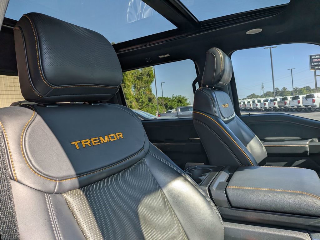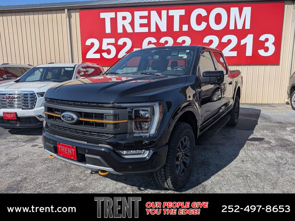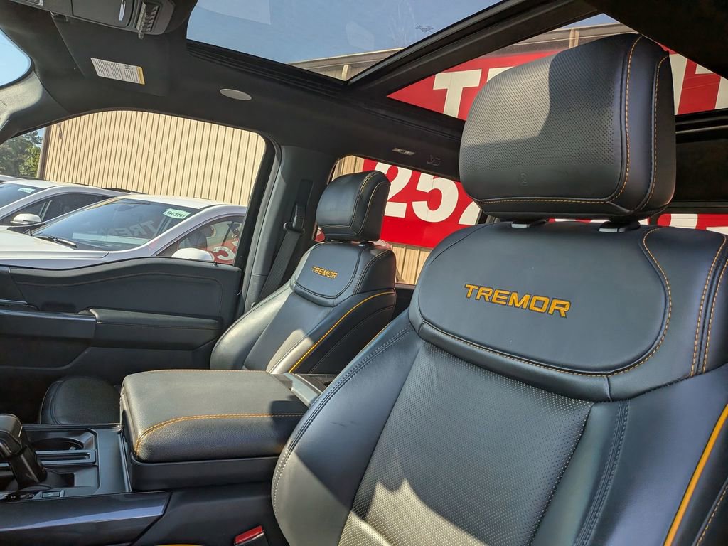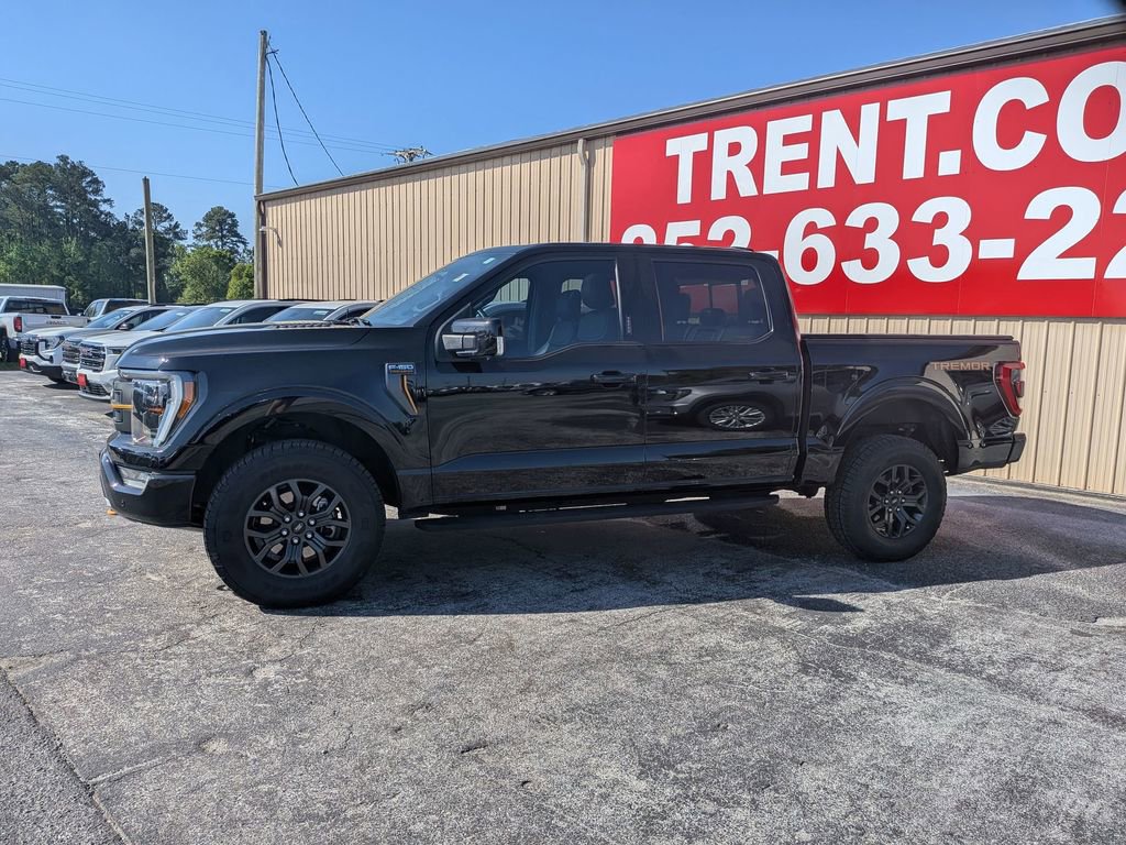 CARFAX One-Owner. Agate Black Metallic 2023 Ford F-150 Tremor Tremor 4WD 10-Speed Automatic 3.5L V6 EcoBoost F-150 Tremor Tremor, 4D SuperCrew, 3.5L V6 EcoBoost, 10-Speed Automatic, 4WD, Agate Black Metallic, Black w/Leather-Trimmed Bucket Seats, ABS brakes, Alloy wheels, Compass, Electronic Stability Control, Front dual zone A/C, Heated door mirrors, Heated front seats, Illuminated entry, Low tire pressure warning, Remote keyless entry, Traction control.This F-150 Tremor is nicely equipped with GVWR: 7,050 lbs Payload Package, F-150 Tremor Tremor, 4D SuperCrew, 3.5L V6 EcoBoost, 10-Speed Automatic, 4WD, Agate Black Metallic, Black w/Leather-Trimmed Bucket Seats, ABS brakes, Alloy wheels, Compass, Electronic Stability Control, Front dual zone A/C, Heated door mirrors, Heated front seats, Illuminated entry, Low tire pressure warning, Remote keyless entry, Traction control, 4-Wheel Disc Brakes, 6 Speakers, Air Conditioning, AM/FM radio: SiriusXM with 360L, Auto High-beam Headlights, Auto-dimming door mirrors, Automatic temperature control, Brake assist, Bumpers: body-color, Class IV Trailer Hitch Receiver, Delay-off headlights, Driver door bin, Dual front impact airbags, Dual front side impact airbags, Electronic Locking w/3.73 Axle Ratio, Emergency communication system: SYNC 4 911 Assist, Exterior Parking Camera Rear, Front anti-roll bar, Front Bucket Seats, Front Center Armrest, Front fog lights, Front reading lights, Front wheel independent suspension, Fully automatic headlights, Navigation system: Connected Navigation, Occupant sensing airbag, Outside temperature display, Overhead airbag, Overhead console, Panic alarm, Passenger door bin, Passenger vanity mirror, Power door mirrors, Power driver seat, Power passenger seat, Power steering, Power windows, Radio data system, Radio: AM/FM SiriusXM w/360L, Rear reading lights, Rear step bumper, Rear window defroster, Security system, Speed control, Speed-sensing steering, Split folding rear seat, Steering wheel mounted audio controls, SYNC 4 w/Enhanced Voice Recognition, Tachometer, Telescoping steering wheel, Tilt steering wheel, Trip computer, Turn signal indicator mirrors, Unique Sport Cloth 40/Console/40 Power Front Seat, Variably intermittent wipers, Voltmeter, and Wheels: 18 Alloy w/Dark Matte Finish.Give us a call at 252-497-8653 to schedule your test drive and let us give you the edge!