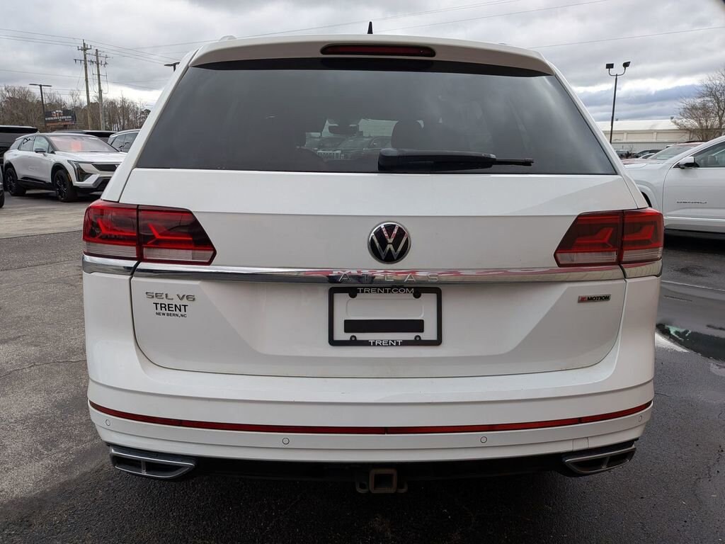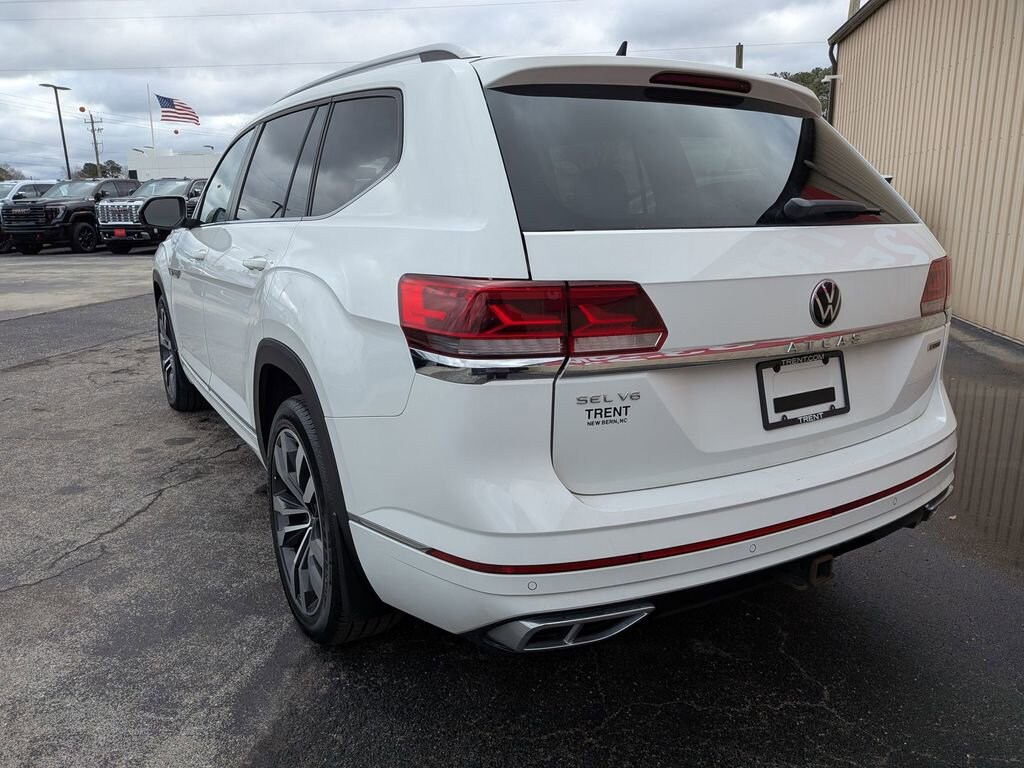 CARFAX One-Owner. White 2021 Volkswagen Atlas 3.6L V6 SEL R-Line AWD 8-Speed Automatic with Tiptronic 3.6L VR6 Atlas 3.6L V6 SEL R-Line, 4D Sport Utility, 3.6L VR6, 8-Speed Automatic with Tiptronic, AWD, White, Black Artificial Leather.This Atlas 3.6L V6 SEL R-Line is nicely equipped with Atlas 3.6L V6 SEL R-Line, 4D Sport Utility, 3.6L VR6, 8-Speed Automatic with Tiptronic, AWD, White, Black Artificial Leather, 3.60 Axle Ratio, 3rd row seats: split-bench, 4-Wheel Disc Brakes, 6 Speakers, ABS brakes, Air Conditioning, Alloy wheels, Auto High-beam Headlights, Auto-dimming Rear-View mirror, Automatic temperature control, Brake assist, Bumpers: body-color, Compass, Delay-off headlights, Driver door bin, Driver vanity mirror, Dual front impact airbags, Dual front side impact airbags, Electronic Stability Control, Emergency communication system: VW Car-Net services (capabilities require enrollment or subscription), Exterior Parking Camera Rear, Four wheel independent suspension, Front anti-roll bar, Front Bucket Seats, Front Center Armrest, Front dual zone A/C, Front fog lights, Front reading lights, Fully automatic headlights, Heated Comfort Front Bucket Seats, Heated door mirrors, Heated front seats, Heated steering wheel, Illuminated entry, Leather Shift Knob, Low tire pressure warning, Memory seat, Navigation System, Occupant sensing airbag, Outside temperature display, Overhead airbag, Overhead console, Panic alarm, Passenger door bin, Passenger vanity mirror, Perforated V-Tex Leatherette Seating Surfaces, Power door mirrors, Power driver seat, Power Liftgate, Power moonroof, Power passenger seat, Power steering, Power windows, Radio data system, Rain sensing wipers, Rear air conditioning, Rear anti-roll bar, Rear reading lights, Rear seat center armrest, Rear window defroster, Rear window wiper, Remote keyless entry, Roof rack: rails only, Security system, Speed control, Speed-sensing steering, Split folding rear seat, Spoiler, Sport steering wheel, Standard Suspension, Steering wheel mounted audio controls, Tachometer, Telescoping steering wheel, Tilt steering wheel, Traction control, Trip computer, Turn signal indicator mirrors, Variably intermittent wipers, and Wheels: 21 2-Tone Machined Alloy. Recent Arrival!Give us a call at 252-497-8653 to schedule your test drive and let us give you the edge!